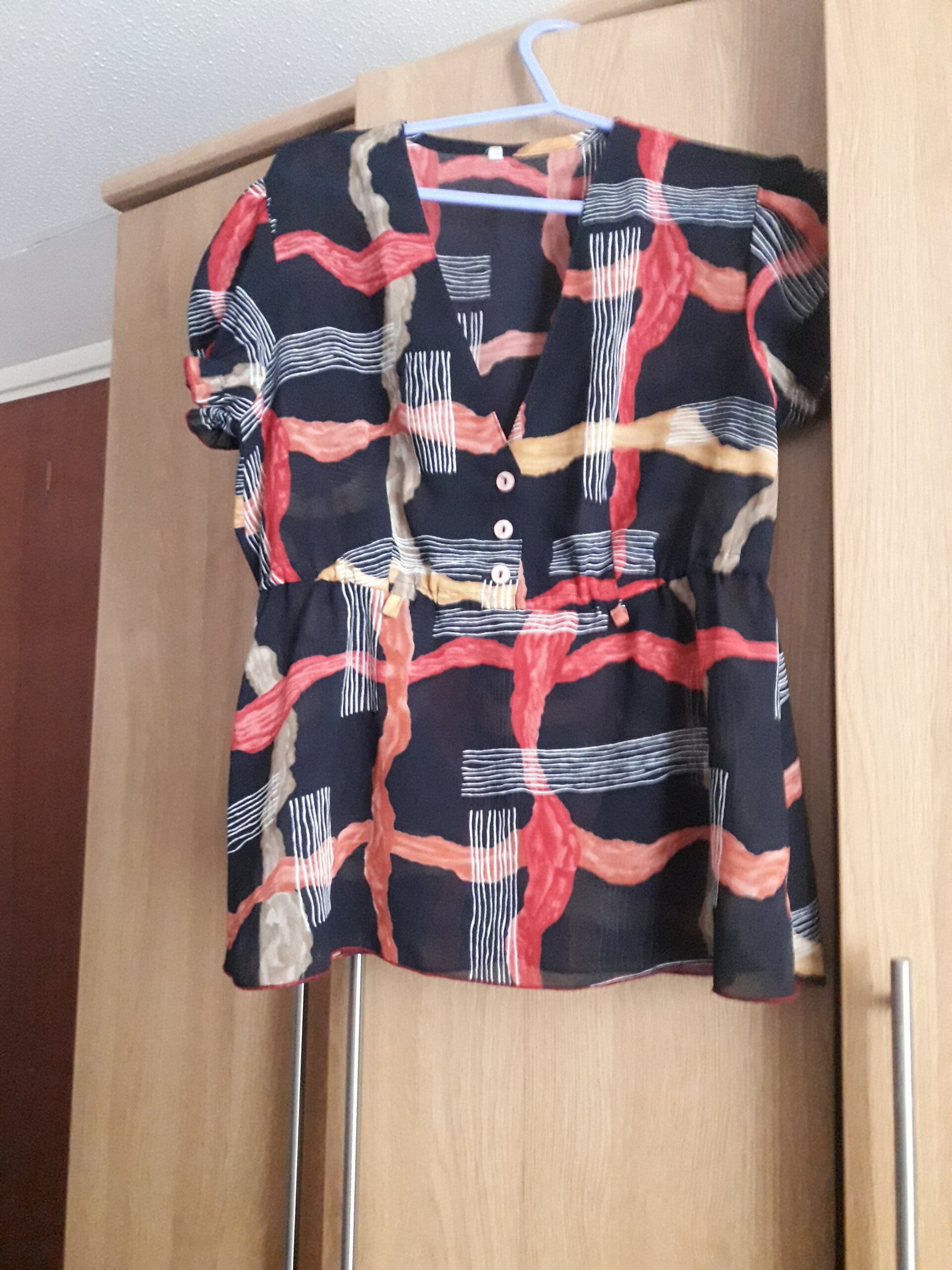 Ladies c thru blouse unbranded make vgc used buttons elasticated cuffs red white black orange pattern.10/12