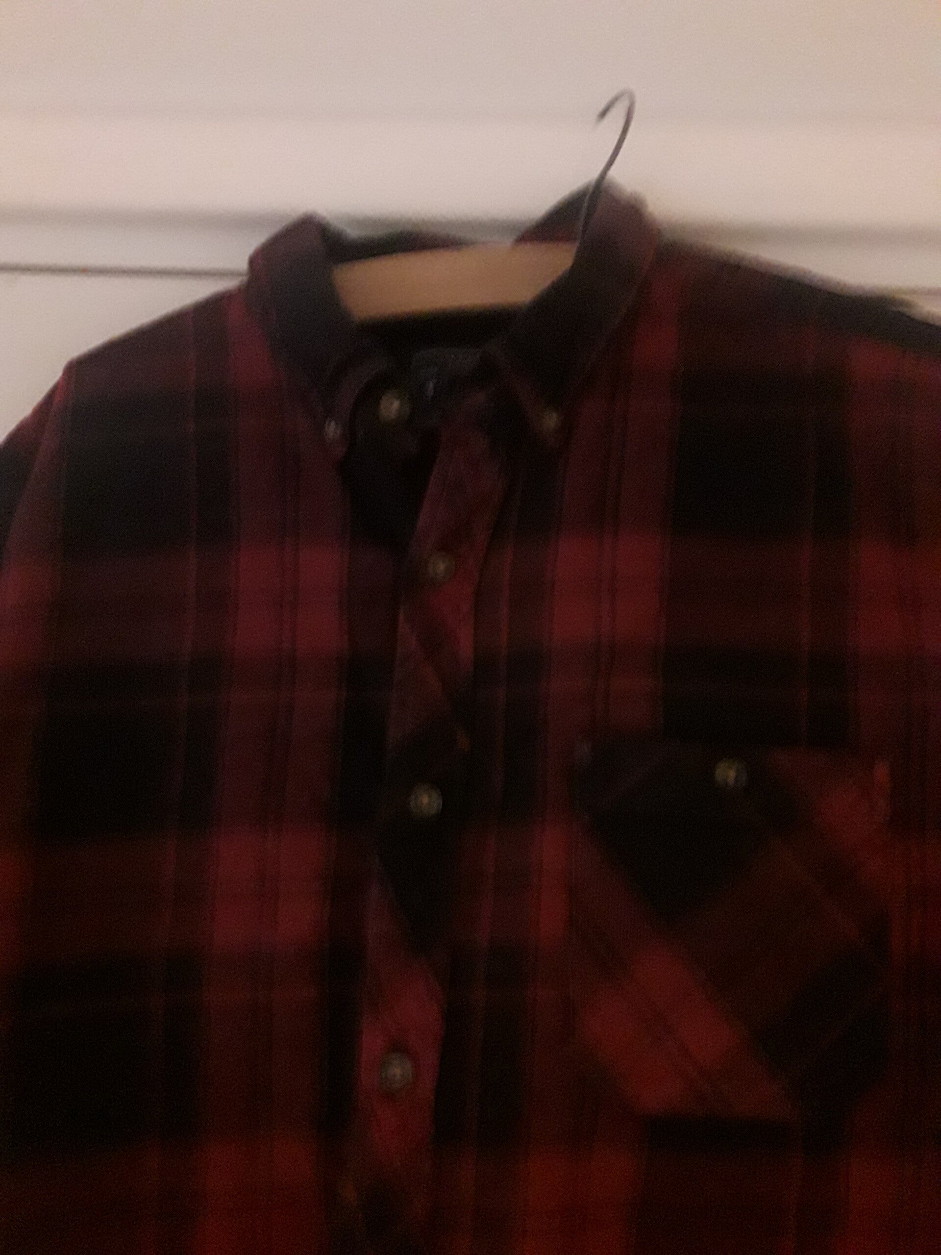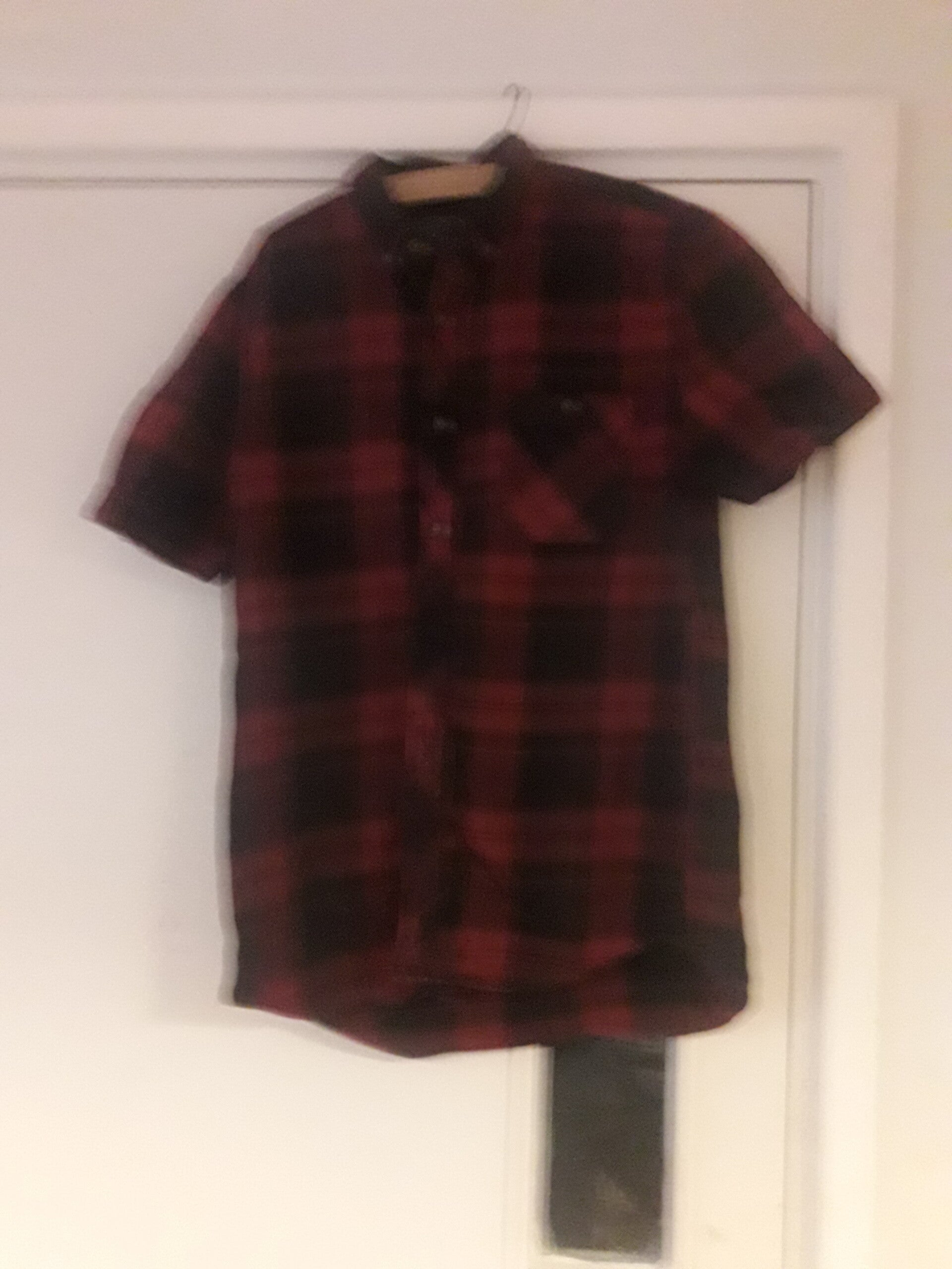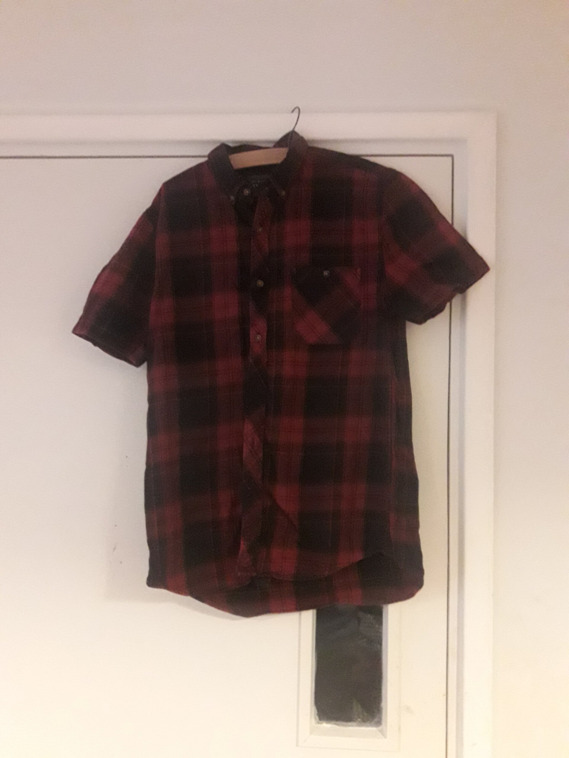 Mans shirt black burgundy check button down collar short sleeves vgc used Cotton.