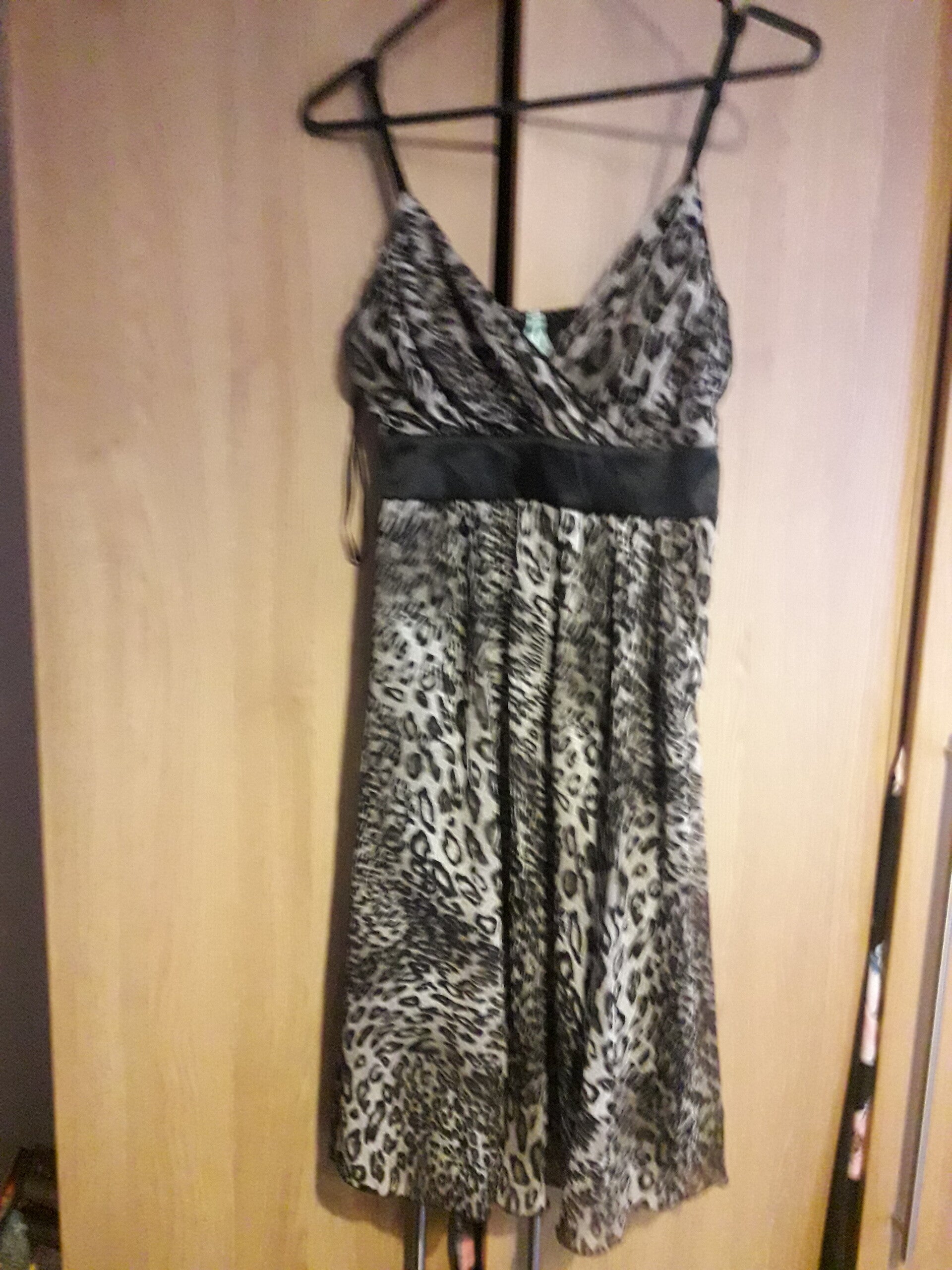 Leopard print dress straps ties back vgc used beige brown black lined ,Pull on,polyester material length 36 inch.