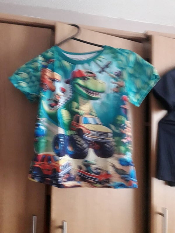 Dinosaurs boys tshirt 5/6 new with packaging red green yellow short sleeves polyester .