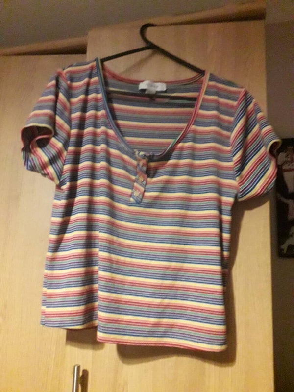 14/16 primark cropped tshirt striped orange red yellow blue green vgc used buttons polyester cotton.