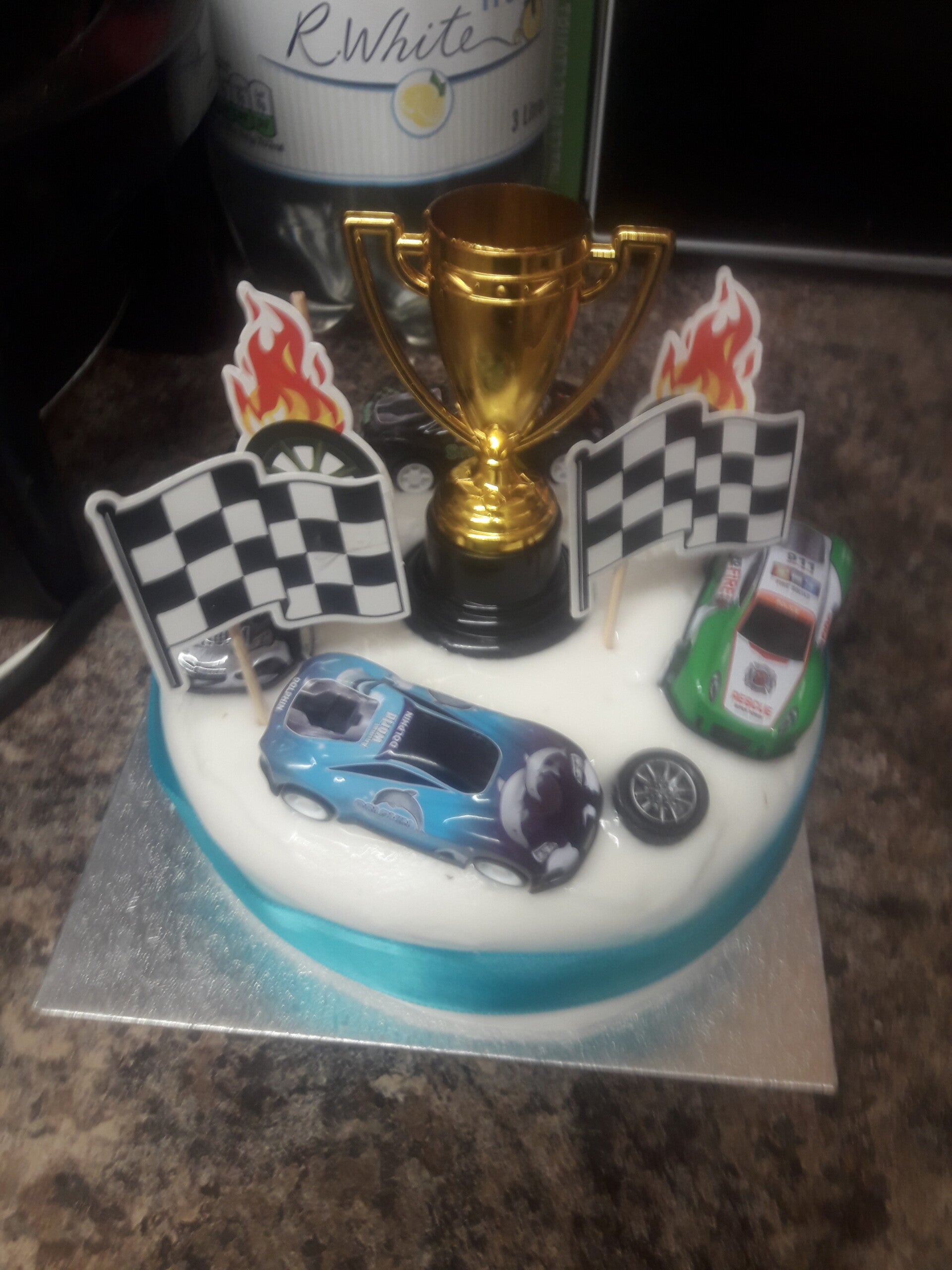 Sponge cake car race decorations iced frosting n raspberry jam in middle