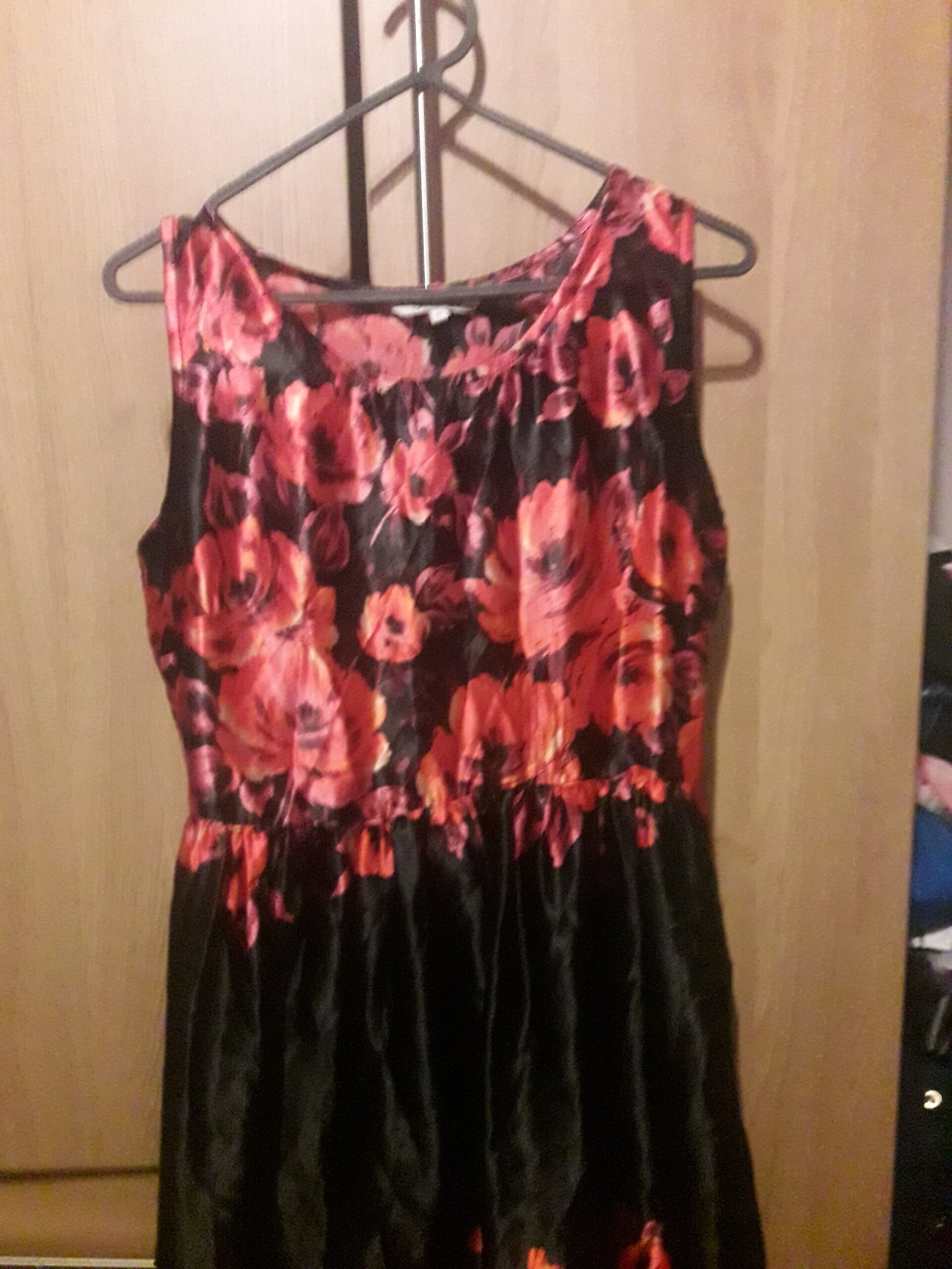 Peacocks dress vgc used black n red silky feel dress sleeveless,size 10, netted underneath skirt ,nice for a party .length 40 inch.midi dress .floral .
