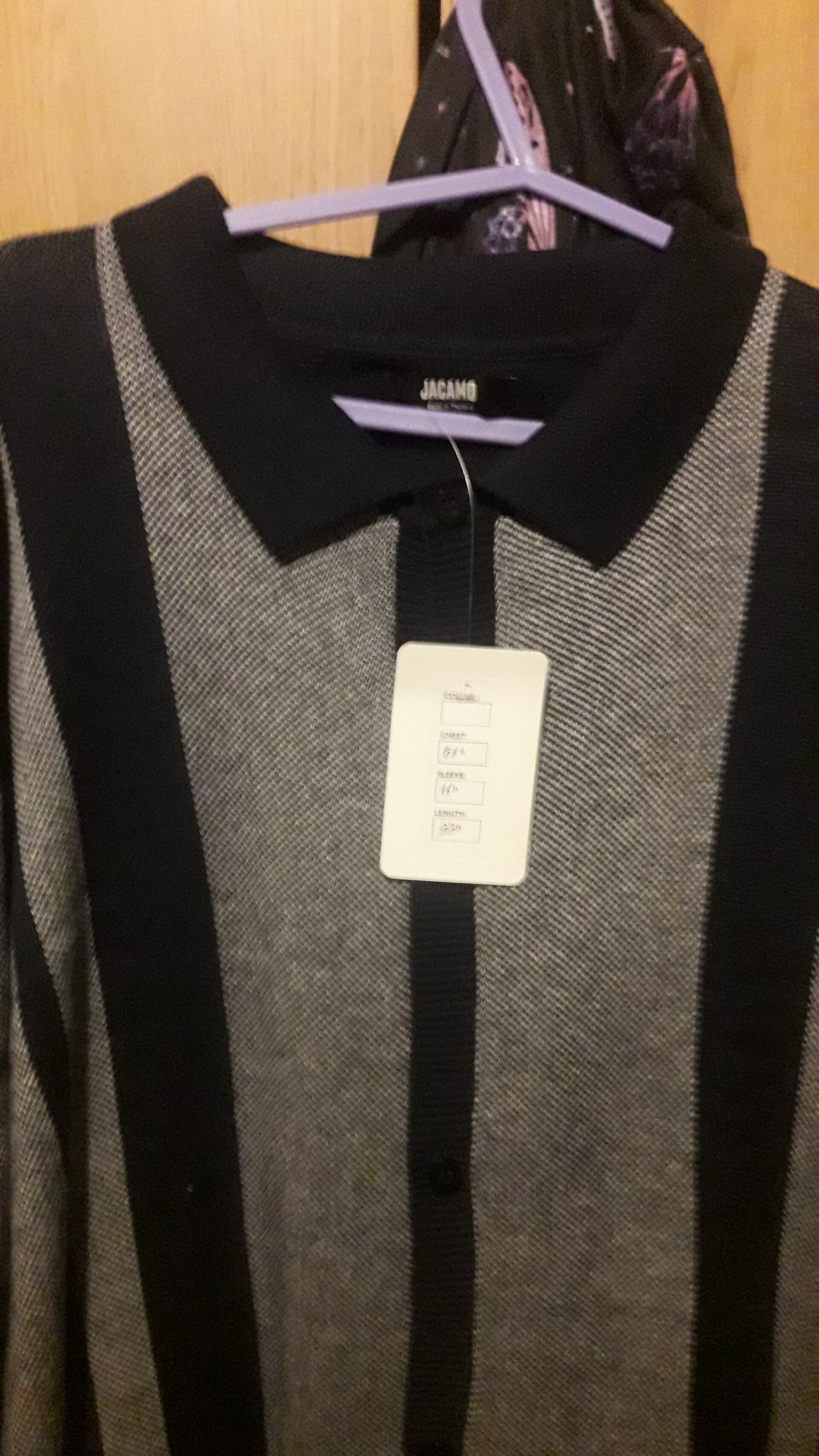 Jacamo 2xlarge thick long button down like cardigan shirt tshirt new with tags.navy n grey pattern.length 33 inch chest 51 inch sleeve 11 inch .short sleeved.