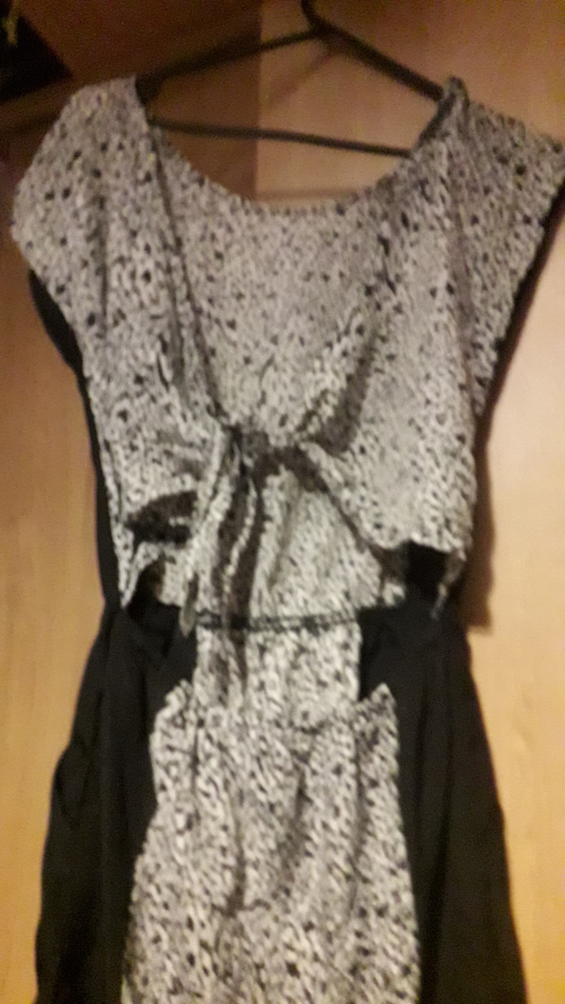 Black n white print miss selfridge dress back out pockets,bow at back elasticated waist short to midi dress size 8 unlined.sleeveless.