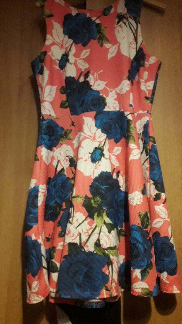 Select dress flora,l vgc used, sleeveless ,size 12, bit flare botton unlined,blue pink white,green length 34 inch.pull on dress.