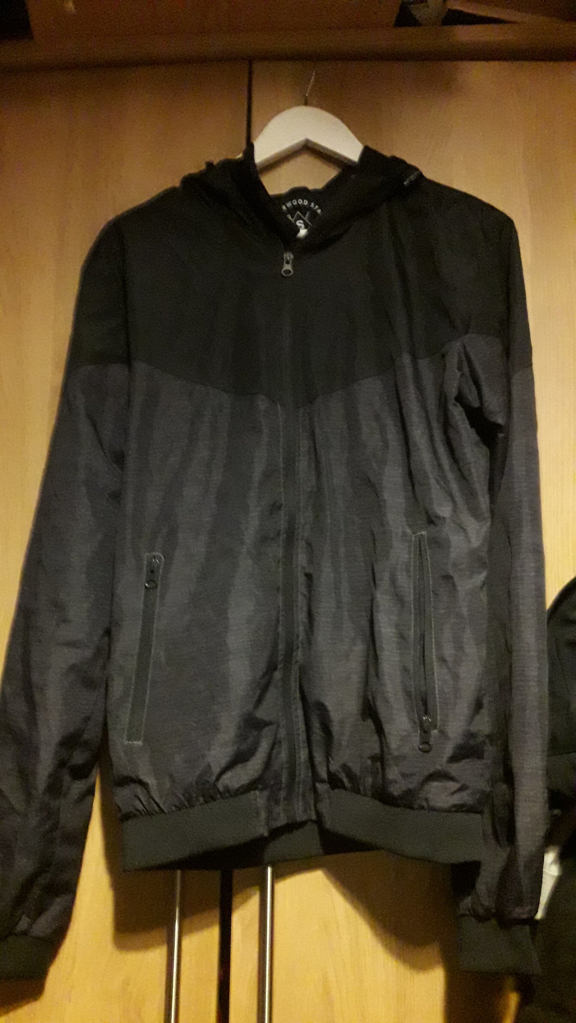 Cedarwood state light unisex jacket ,black n grey,long sleeves,hooded,zip up pockets,zip ip jacket size small,vgc used,length 26 inch.material polyester.