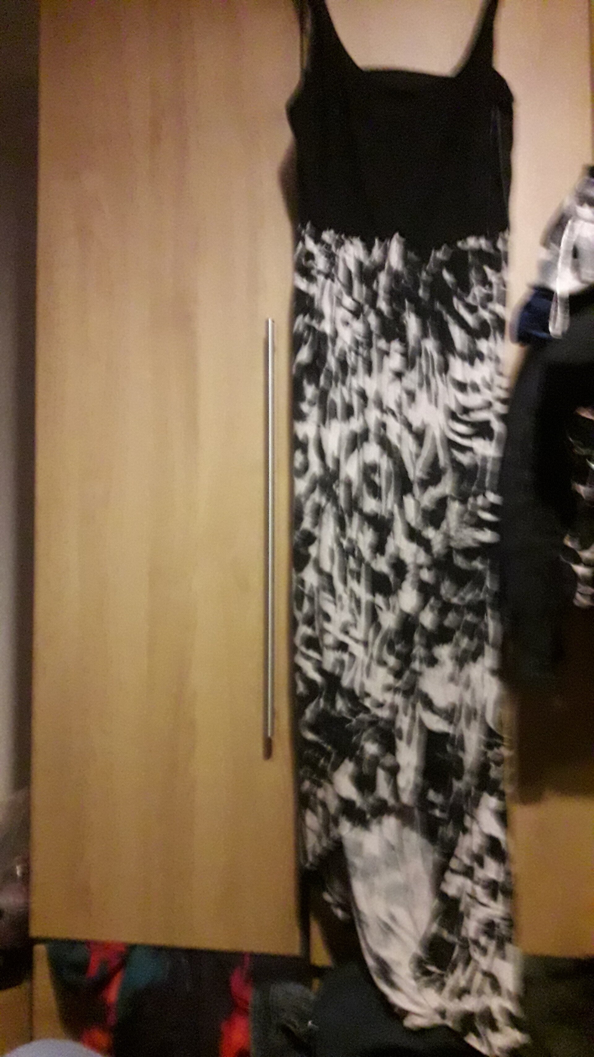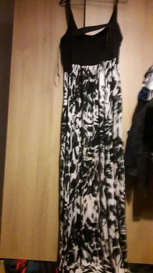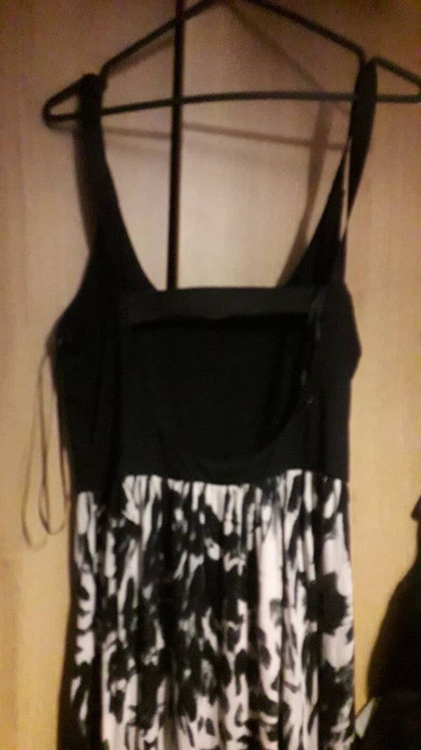 Miss selfridge dress ,used vgc, long ,black n white print size 12 ,strappy elasticated straps,give in the waist, unlined, length 49 inch.material viscose n elastane.up at bit at front n longer at back.bit back out at back.