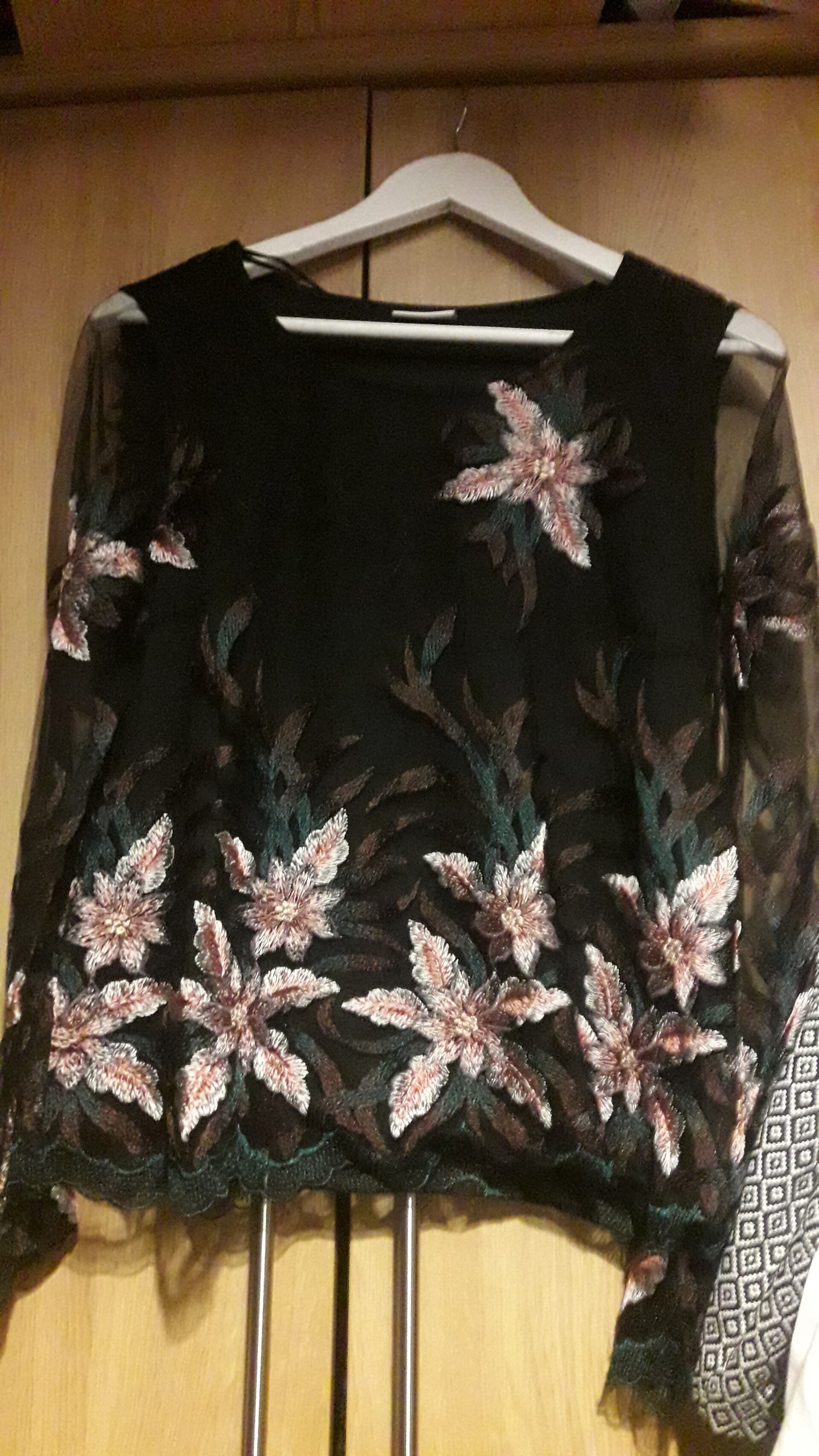 Size medium villa top floral, vgc used black pink,embroidered top long sleeves, lined,netted,length 24 inch,material polyester .