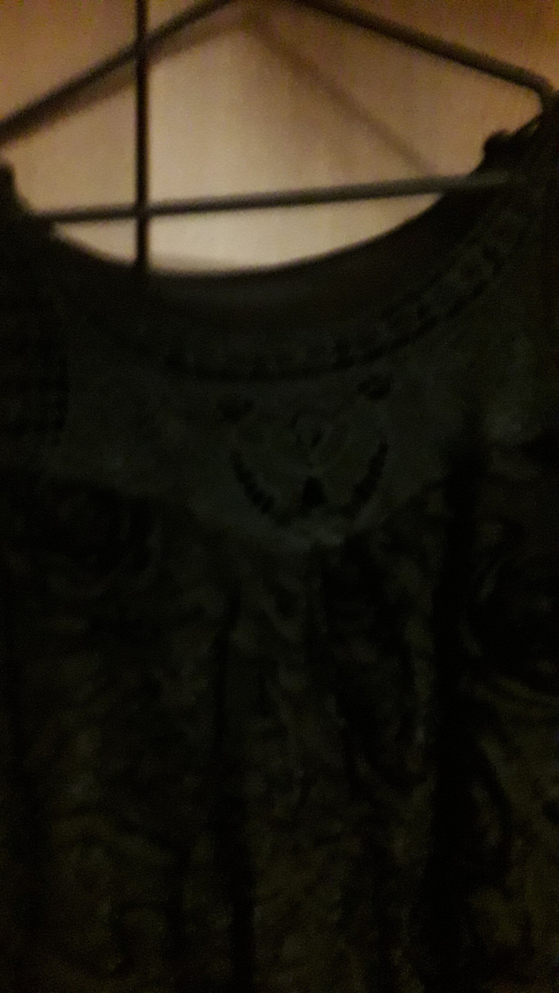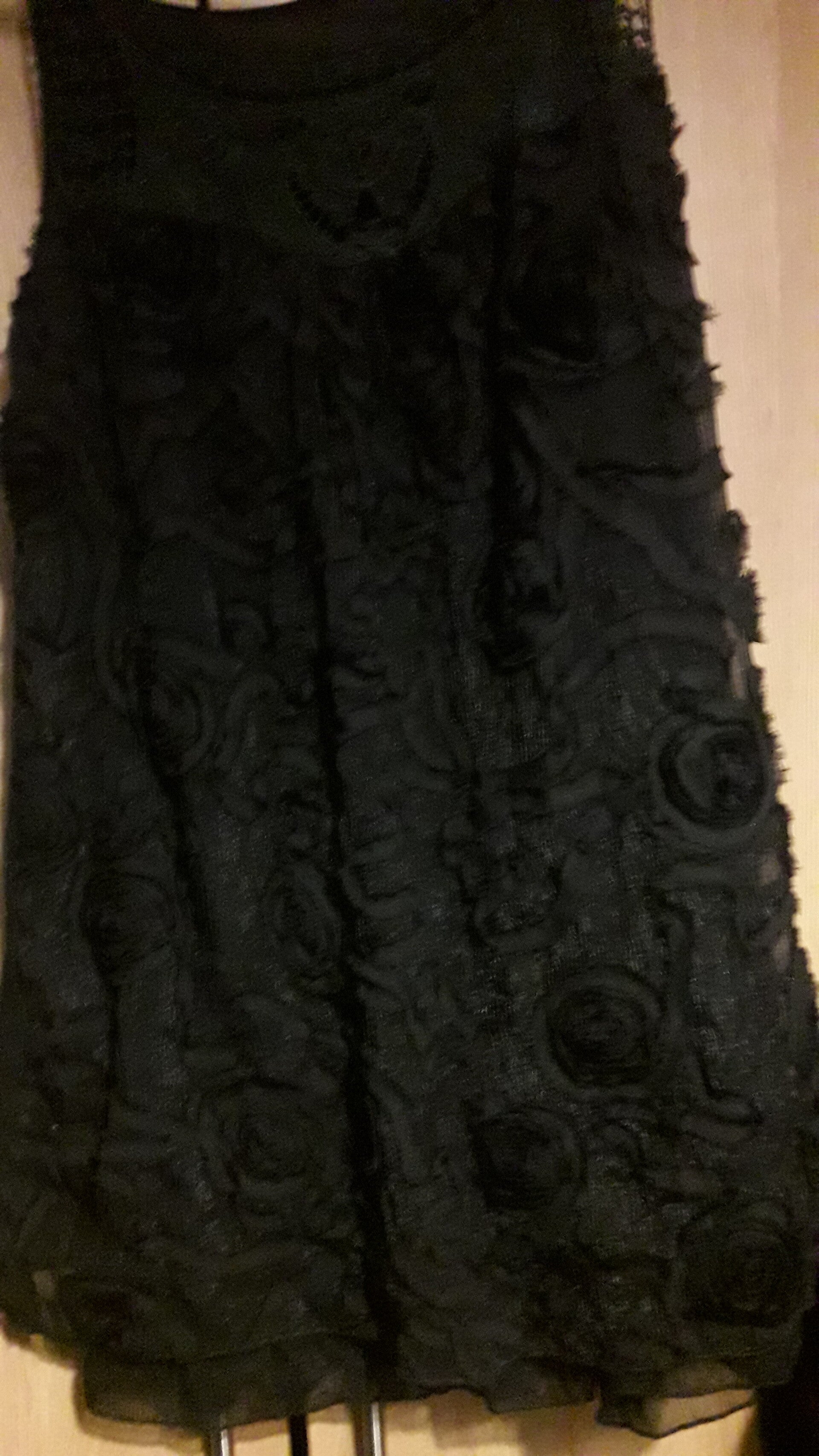 Black floral print ladies lined top black,sleeveless, vgc used unbranded, length 30 inch, material polyester.