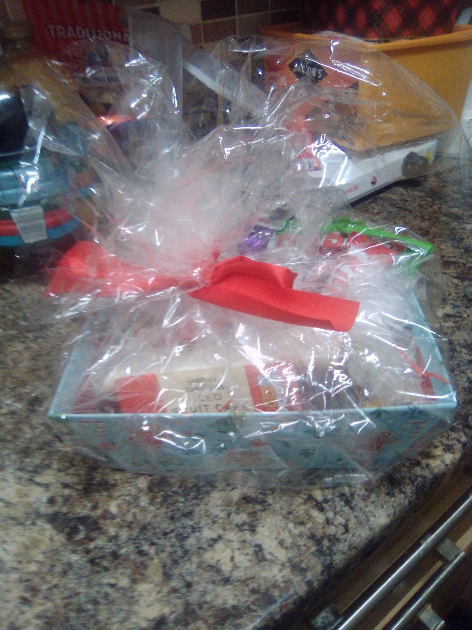 Xmas sliced cake and haribo packet, chocolate bars in bueno bars twirl kit kats choc Santa n reindeer in n chocolate toffee.bars,small hamper for 2026 Xmas n medium n large hampers,will be taking orders from September 2026 cake hampers,choc hampers,groceries hampers .